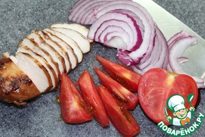 Дать баклажанам и грудке остыть минут пять. Порезать грудку, лук, помидоры.