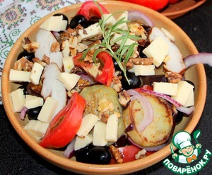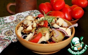 В большой салатник выложить баклажан, куриную грудку, помидоры, маслины, лук. Перемешать.