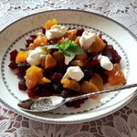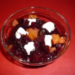 Свеклу (печеная) нарезать небольшими кубиками, слегка присолить, добавить курагу, перемешать.