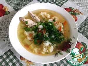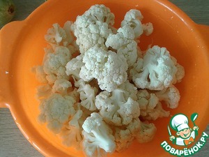 Цветную капусту разбираем на соцветия и добавляем в бульон.
