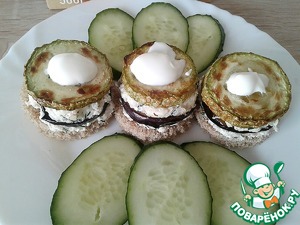 Сделать "башенки", используя "овсянку" в качестве крема, в таком порядке: хлеб, "овсянка", баклажан, "овсянка", кабачок.