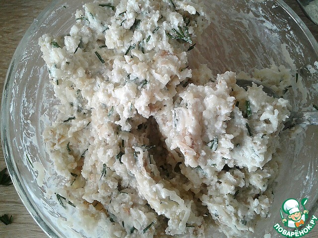 К хлопьям добавить творог, мелко натертые сыр и чеснок, нарезанный укроп и сметану.