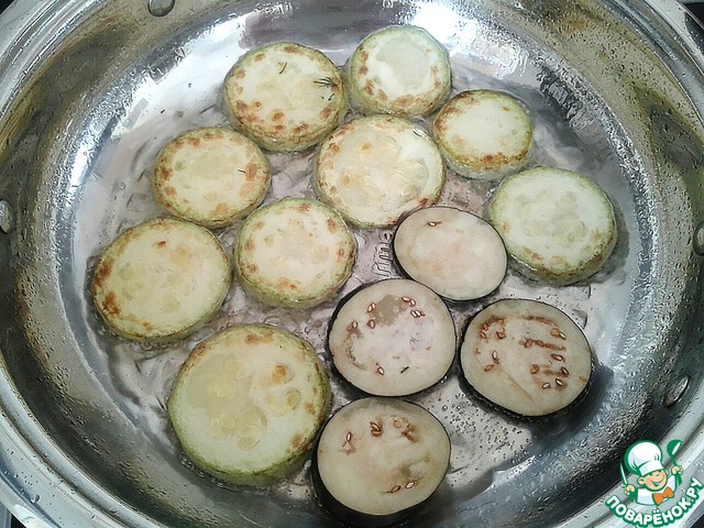 Обжарить кабачки и баклажаны с двух сторон на сковороде, сложить на бумажное полотенце.