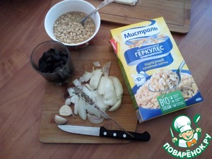 Запариваем грибным бульон геркулес. Лук режем произвольно.