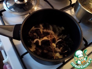 Грибы отвариваем в подсоленной воде до готовности. Откидываем на дуршлаг, бульон сохраняем. -