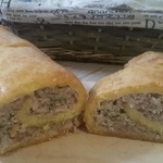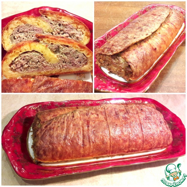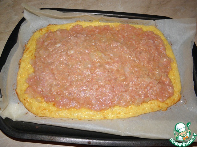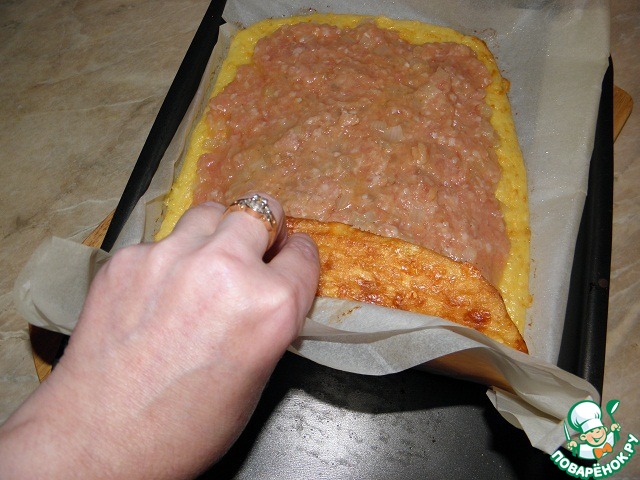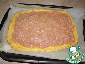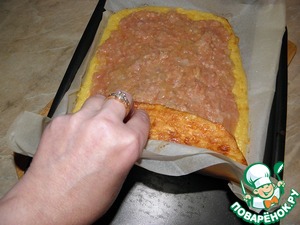Выкладываем мясную начинку на корж, ровно ее распределяем