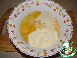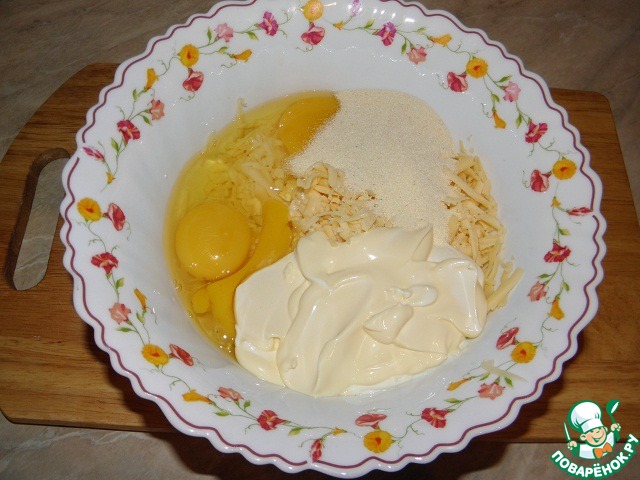 Добавляем к сыру 3 яйца, 3ст. л манки, майонез