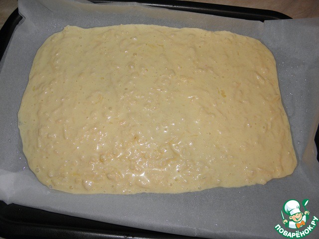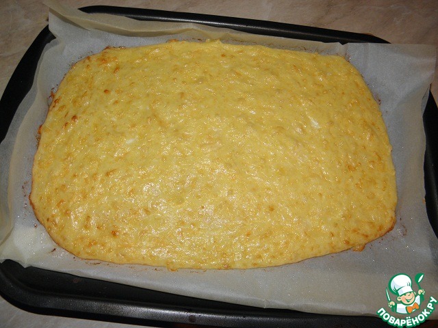 Выкладываем тесто на пергаментную бумагу для выпечки ( или коврик), я немного смазываю раст. маслом. Распределяем тесто по поверхности в виде квадрата или прямоугольника. Ставим в разогретуй 180% духовку на 20 минут
