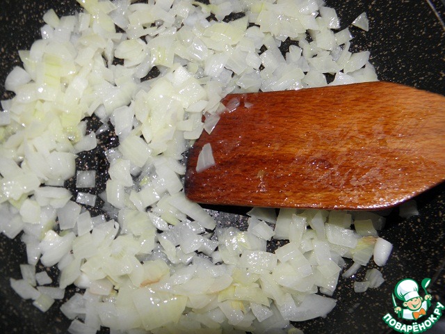 Тем временем готовим начинку: Режем мелко лук, я его немного обжариваю припускаю на сковороде ( если хотите добавлять сырой. тогда надо увеличить последующие время приготовления рулета)
