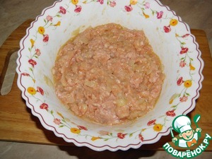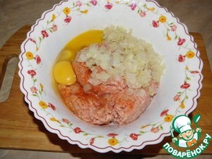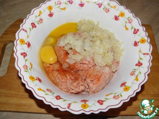 К фаршу добавляем 2 яйца, соль, перец. любимые специи по вкусу, лук