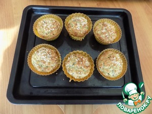 Берём формочки. Я взяла силиконовые. Раскладываем в них тесто на 2/3 высоты формочек. Тесто будет подниматься. Формочки не требуют у меня подмазки, а так, если формочки керамические или металлические, их лучше смазать маслом. Присыпаем сверху по щепотке кунжутом. Из этого количества теста получилось 6 шт кексов. По 2 шт на порцию вполне нормально для тех, кто следит за фигурой и своим здоровьем.