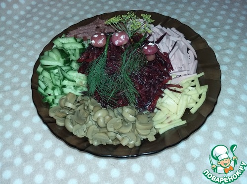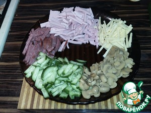Отправляем в холодильник, а тем временем нарезаем наши составляющие салата брусочками на тарелку кучками. Шампиньоны дольками.