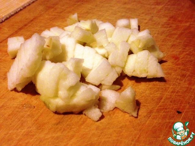 Яблоко очистиь, удалить семенную коробочку и нарезать кубиками.