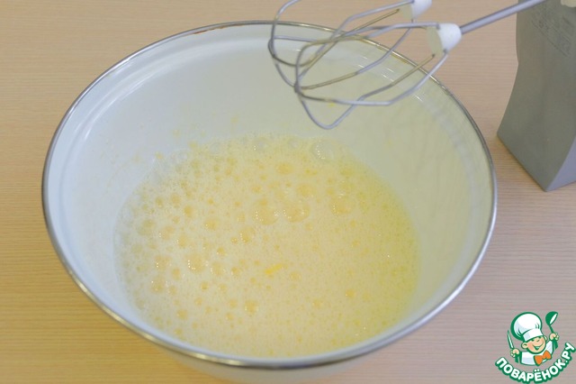 Два яйца добавить в миску. Взбить. Добавить сахар (2,5 ст. ложки) и соль (1,5 ч. ложки). Смесь еще раз хорошо взбить.