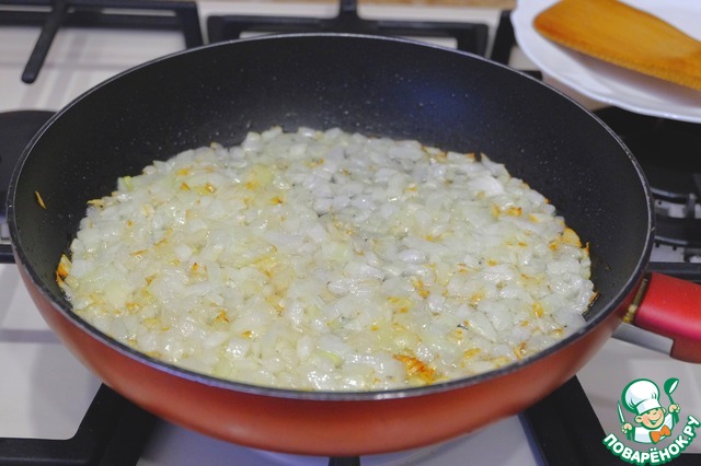 На сковороду добавить добавить 4 ст. ложки растительного масла, добавить мелко порезанный репчатый лук.