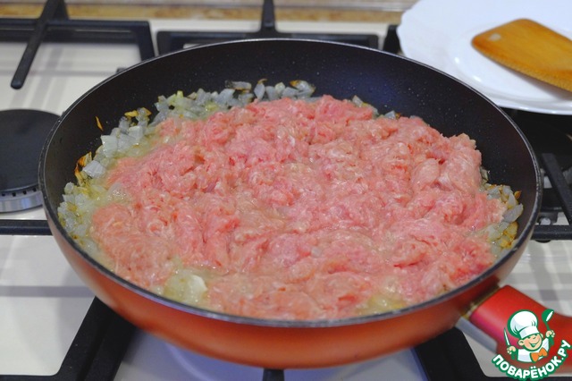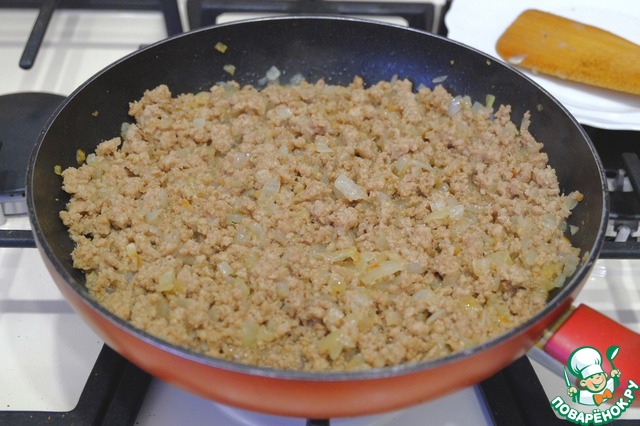 К пассерованному луку добавить мясной фарш. В данном рецепте я использовала фарш свинина+говядина в соотношении 30%/70%, т. е. говядины чуть получилось больше. Добавить 1/2 стакана мясного бульона или воды. Тушить до готовности и выпаривания жидкости.