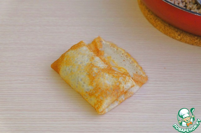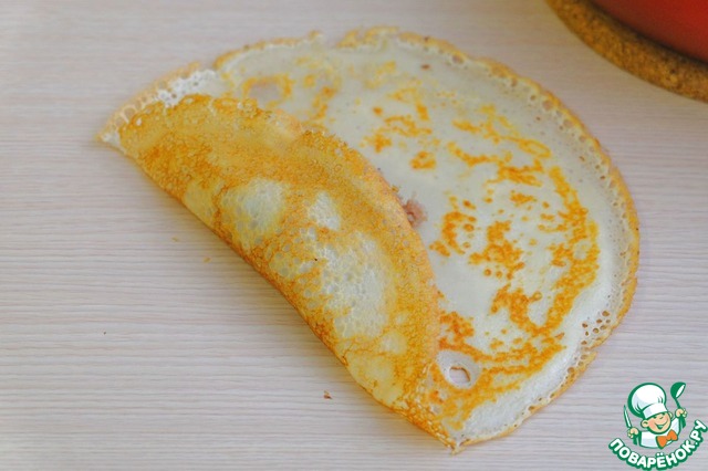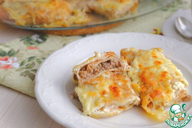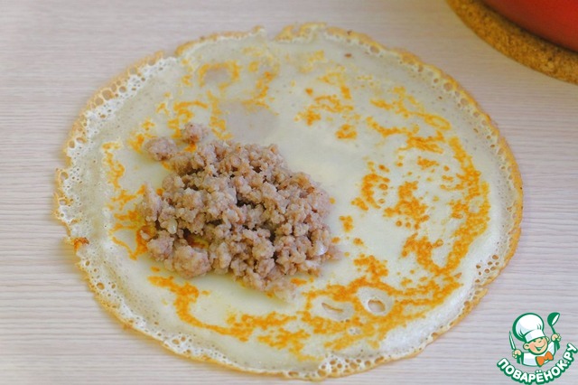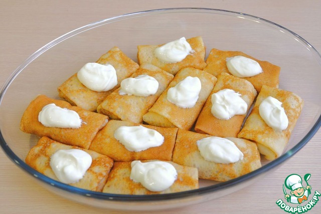 Рецепт «Блины с мясом под сметаной и сыром»: