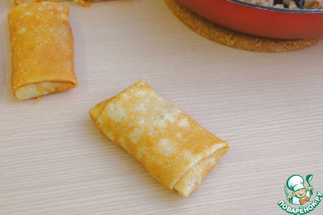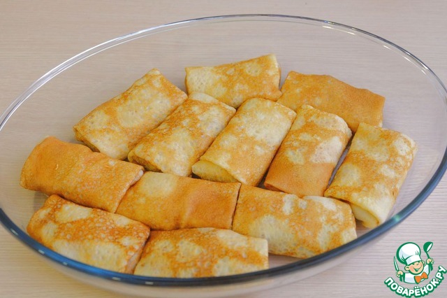 Форму для запекания смазать растительным маслом. Выложить блинчики в форму для запекания.
