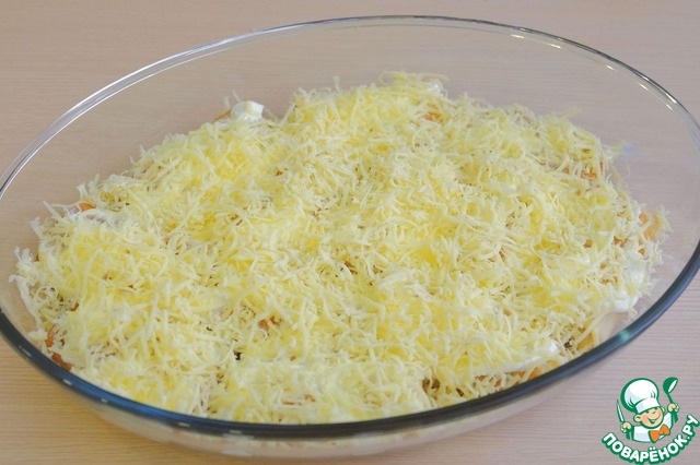 Сыр (100 гр.) натереть на терке. Посыпать блинчики сырной соломкой. Форму отправить в разогретый до t180-200С духовой шкаф на несколько минут для запекания и подрумянивания сыра.