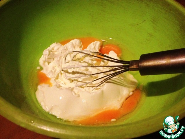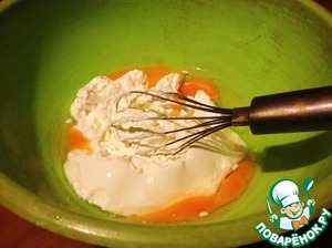Сахар, соль соединить. Добавить яйца взбить венчиком. Добавить сметану. Перемещать.
