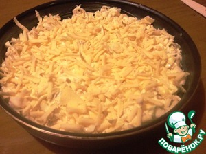Фому диаметром 23 см смазать маслом. Выложить в форму тесто, разровнять. Сверху посыпать тёртым сыром. Поставить в разогретую духовку.