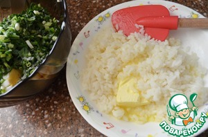 Смешать с яйцами и зеленью. -
