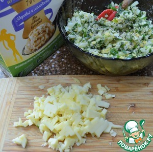 Сыр нарезать мелким кубиком, добавить в начинку.