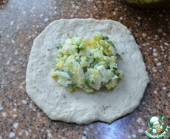 Расплющить колобок в лепешку, 9-10 см. диаметром.
