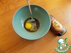 В посуду наливаем соус и разбиваем яйцо. Соединяем.