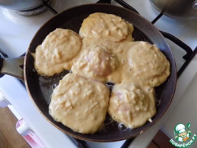 Наливаем масло на сковороду и разогреваем его хорошо. Обмакиваем дольки помидоров в кляр (щедро) и выкладываем на сковороду. Я использовала блинную сковороду D-24 см. Уложила на неё полностью 6 долек помидоров.