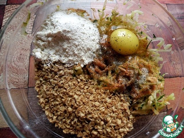 Добавить яйцо и пряности, посолить, всыпать хлопья и муку. Перемешать.