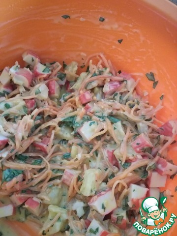 Соединить морковь по-корейски, крабовые палочки и ананас. Перемешать.
