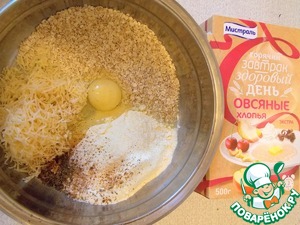 Сыр натереть на мелкой терке. Все ингредиенты сложить в чашу и замесить густое тесто. Дать постоять 10 мин.