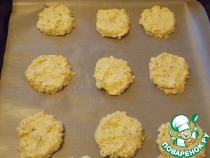 На противень положить бумагу для выпечки и смазать маслом или тефлоновый лист для выпечки. Выложить тесто, смоченной в воде, ложкой и сформировать лепешки.