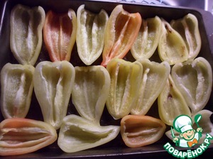 Дно формы для запекания смазать маслом и выложить половинки перца
