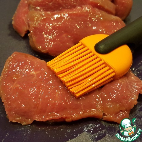 При помощи кулинарной кисти смазать каждый кусочек мяса с обеих сторон соусом-маринадом.