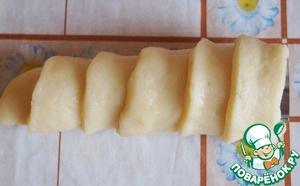 Тесто раскатать в прямоугольник и разрезать на полоски (шириной 2 см., длинной 20-25 см.)