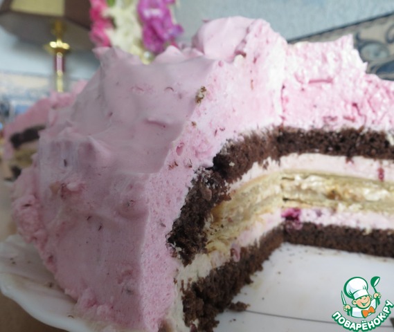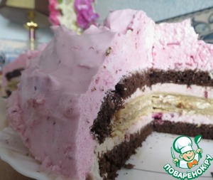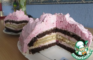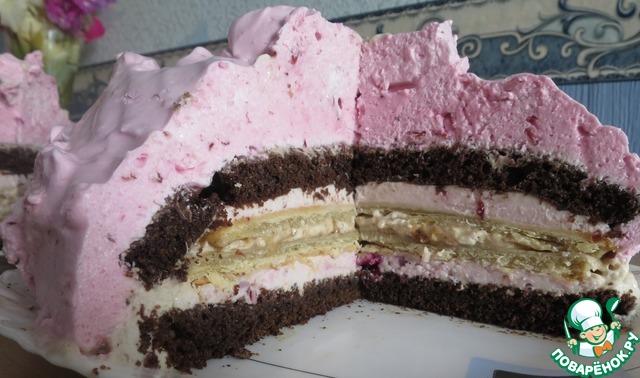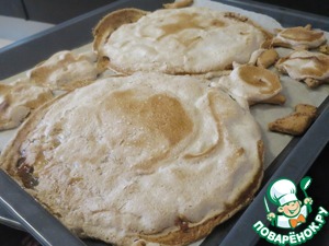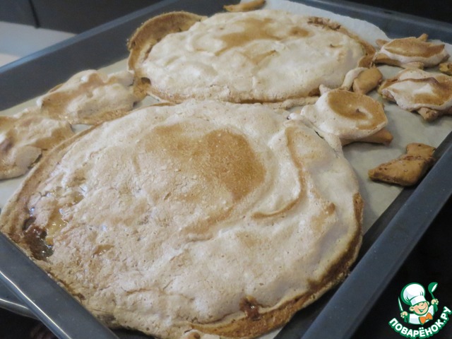 Каждую часть теста раскатать по размеру шоколадного коржа. Выпекать при 180 градусах, 5 минут, после выложить на каждую заготовку белковую массу, разровнять, выпекать ещё 15 - 20 минут, до легкого подрумянивания безе. Испечь оба коржа. Остудить.