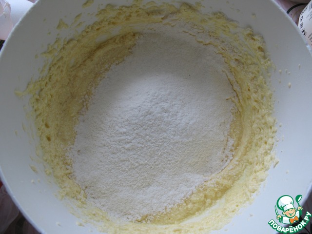 • Добавить муку, смешанную с солью и разрыхлителем.