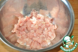 Берём куриное филе, у меня - грудка и режем мелкими кубиками. -