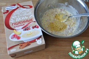 Берём хлопья пшённые от ТМ "Мистраль", кладём к куриному филе, перемешиваем. Отставляем на 5 минут для набухания.