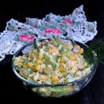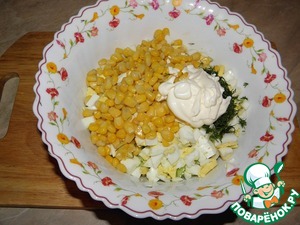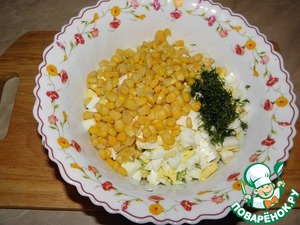 Затем добавить измельченный укроп и кукурузу (жидкость слить)