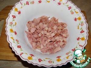 Копчёную курицу очистить от костей и кожицы, затем нарезать кубиками.