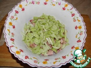 Огурцы очистить от кожицы и нарезать соломкой, добавить к курице