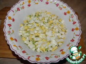 Яйца (заранее сварить) нарезать кубиком, добавить к к курице и огурцам