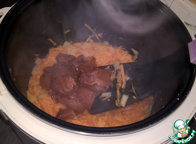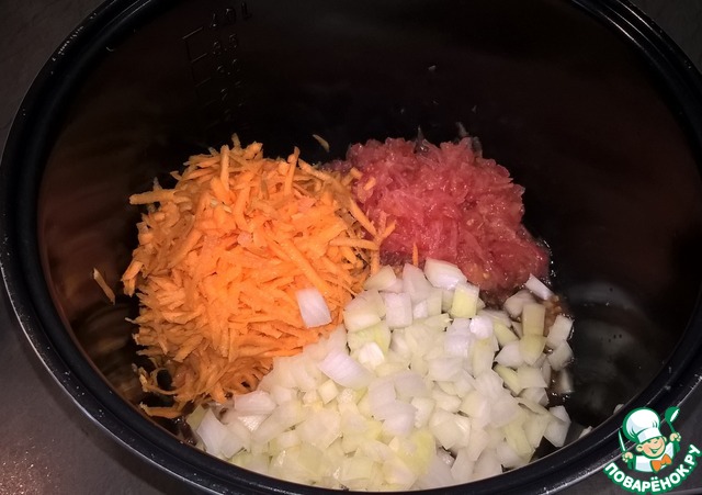 Морковь потереть на крупной терке, помидор также потереть на крупной терке (большие я режу на 4 части, тру и кожура остается в руке), а можно просто мелко порезать. Лук порезать некрупно и вместе с морковью и помидорами (и с соком овощей) выложить в чашу мультиварки. Добавить оливковое (или любое растительное) масло и установить программу "Жарка" на 10 мин. Овощи помешивать, они не должны зажариваться, надо, чтобы они немного протушились в собственном соку и в масле.