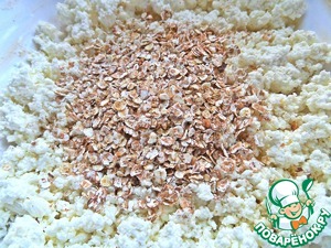 Съёмную форму (18 см диаметром) застелить пергаментом, смазать и посыпать дно хлопьями.
