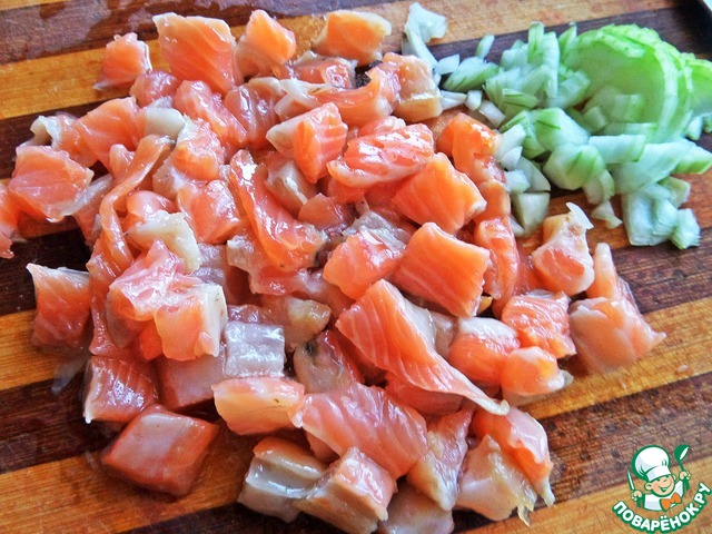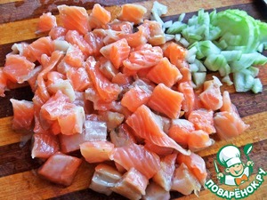 Лосось (у меня малосольный) нарезать кубиками, лук измельчить.