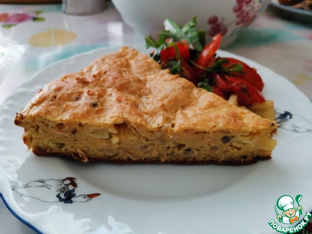 Пирог очень простой в приготовлении, не нужно выпекать отдельно корж. Рыба подходит любая, возможно использовать консервированную. Остальные продукты есть в каждом доме. Вкусно на завтрак с чаем/кофе. Тесто похоже на заливные пироги: нежное, чуть влажное в тёплом виде, при остывании станет плотнее.