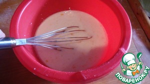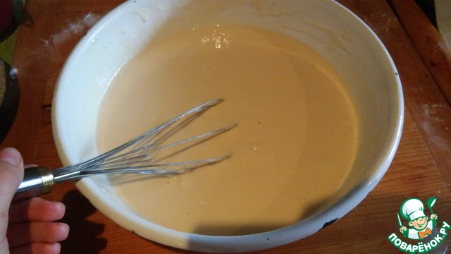 Постепенно добавляем нашу смесь в сухие ингредиенты. Помешиваем венчиком, разбиваем все комочки. По консистенции тесто должно напоминать не очень густую сметану.